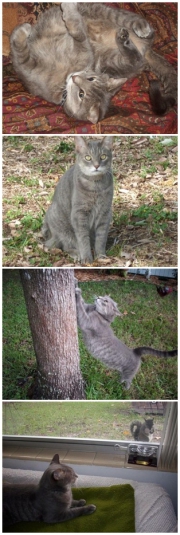 Taffy may have been the only cat to understand the word “exercise”. When we were in the front yard with him, and we would say to him, “Taffy, Exercise!”, he would strut over to the tree with his tail held high, stand up and proudly shred a few pieces of bark off the tree. It is one of our fondest memories of our little guy.